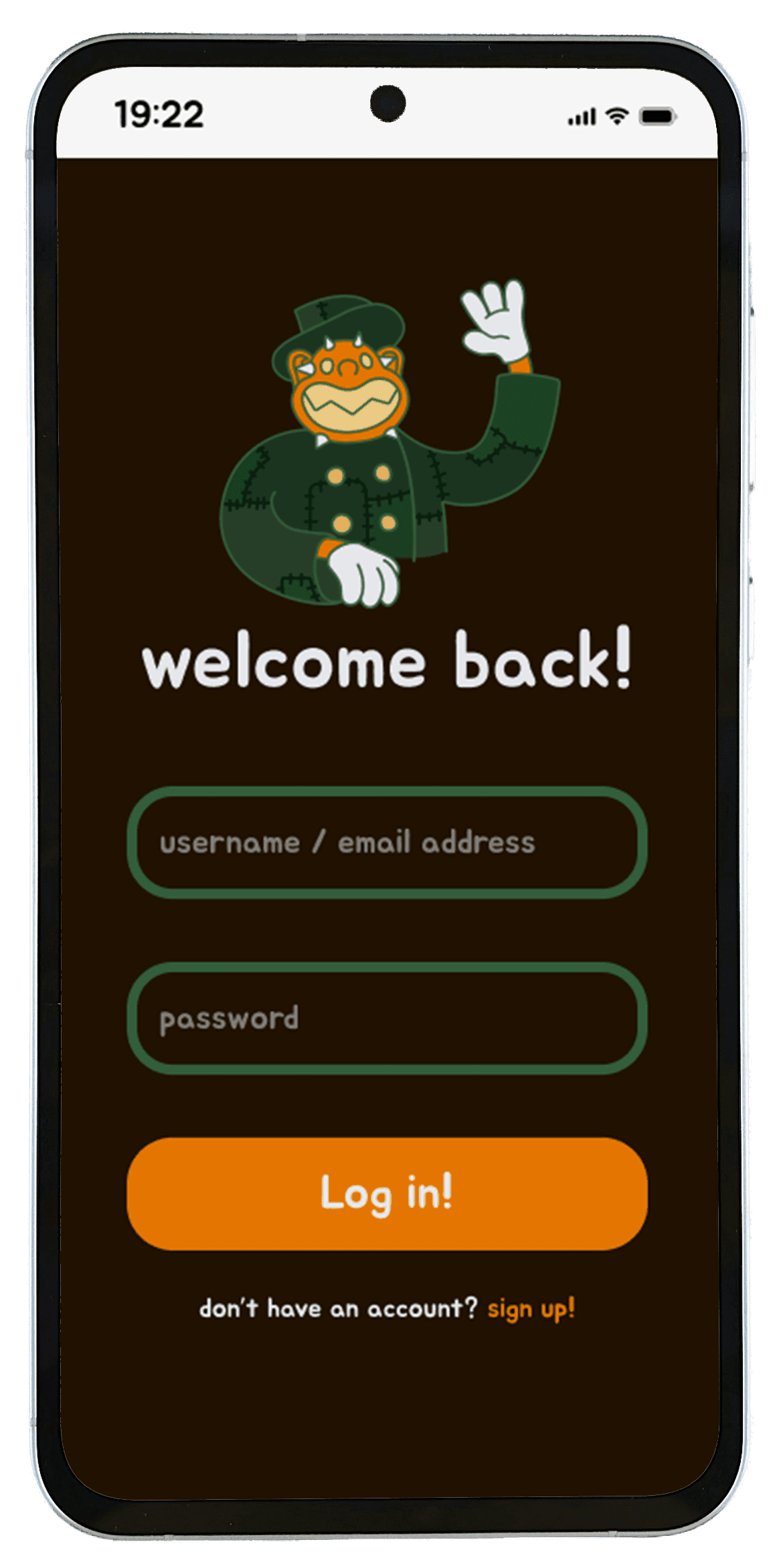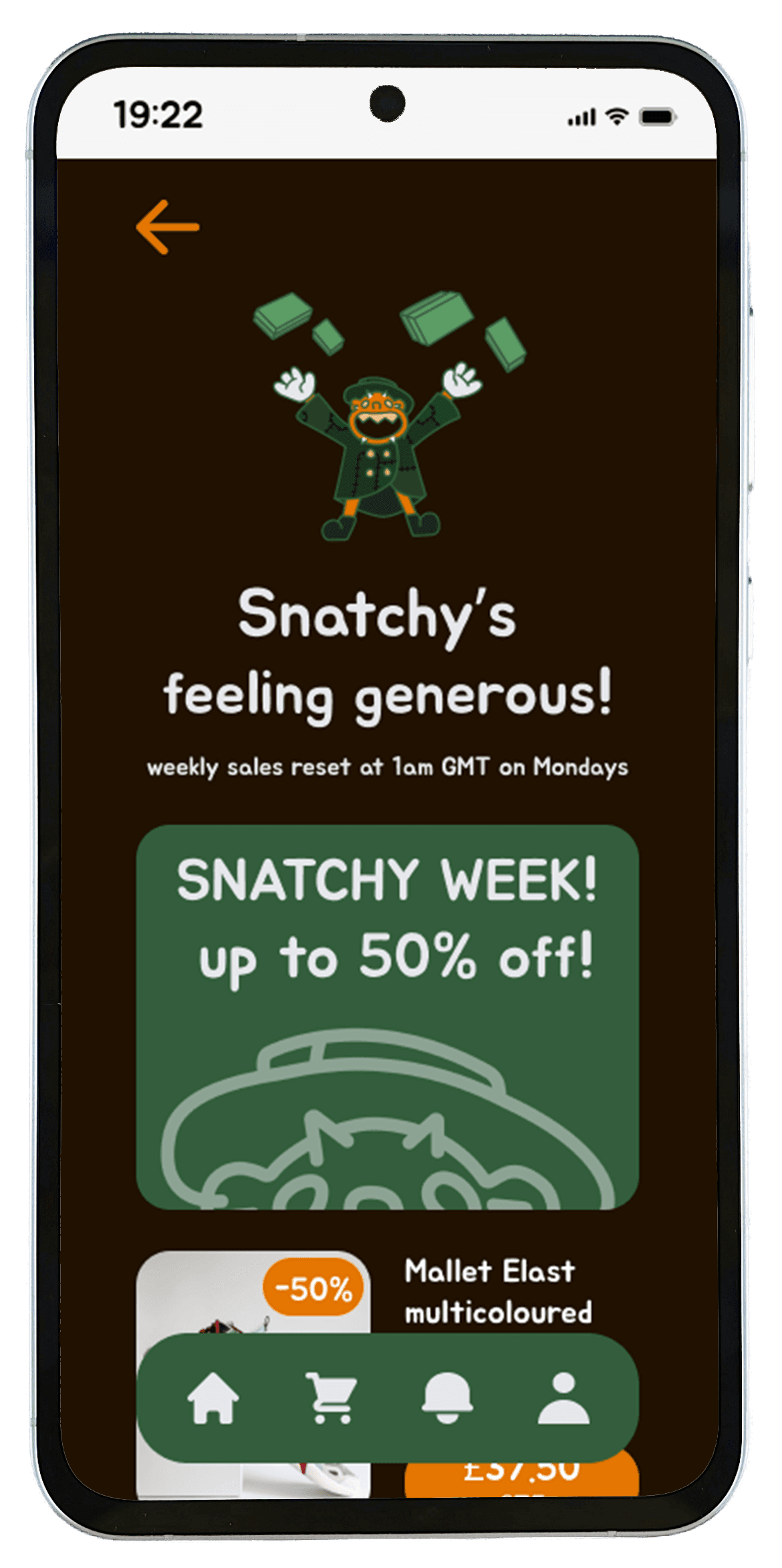 A very simple character - the name Snatchy given as a hint to his kleptomania, his colour scheme made to reflect his cheeky spirit with the orange, but his true positive nature in the green.