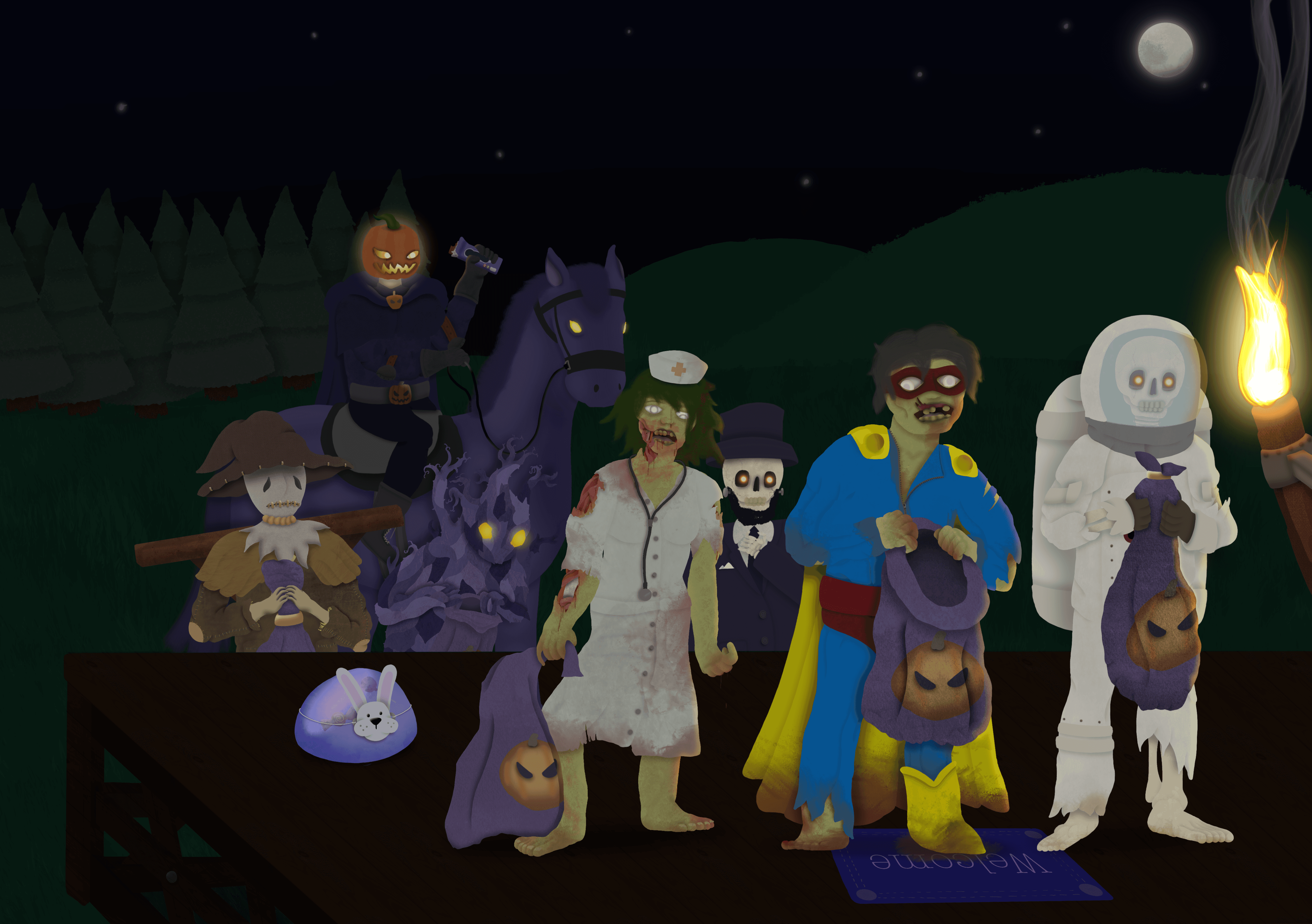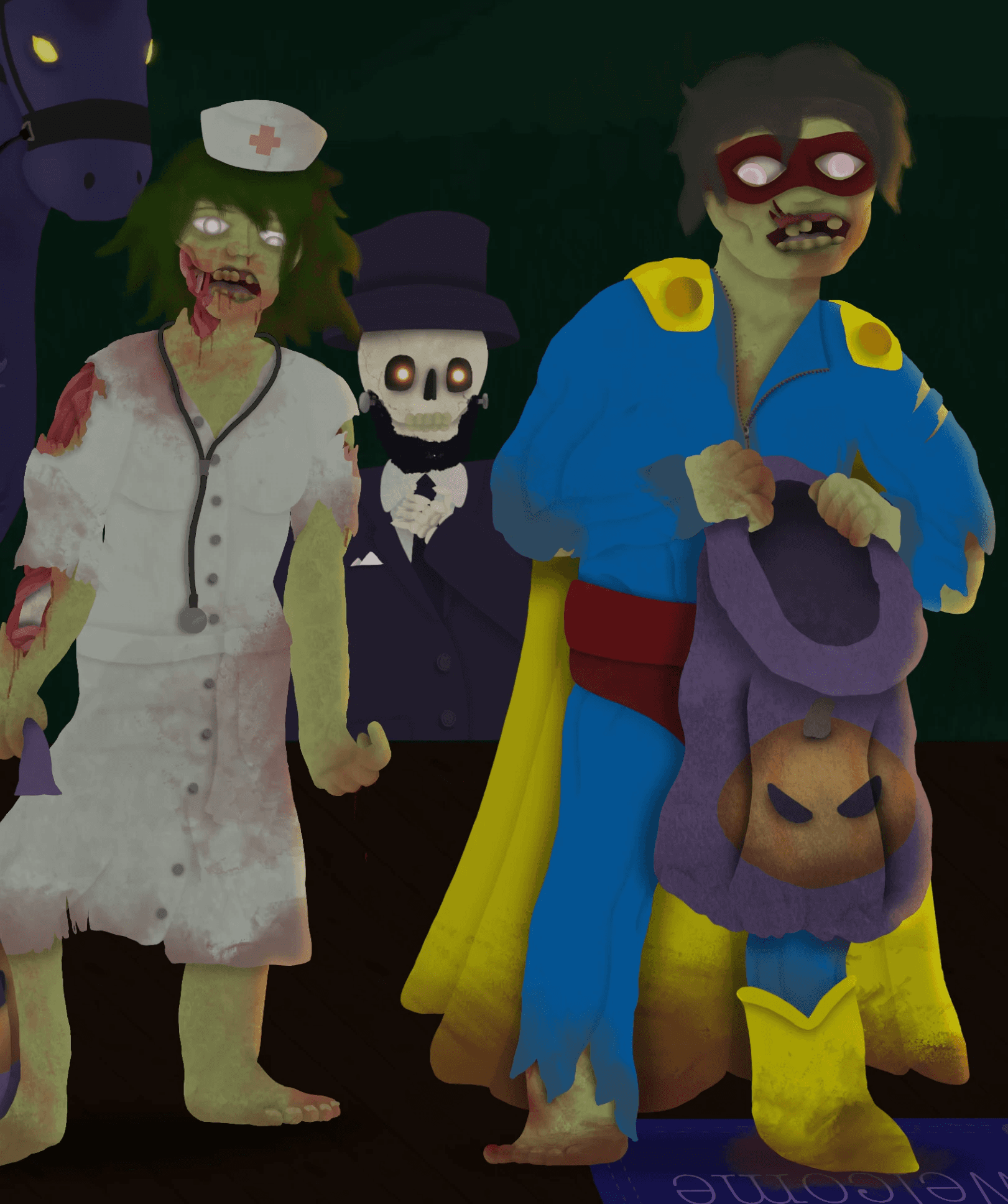 enemies of the game in halloween costumes, trick or treating